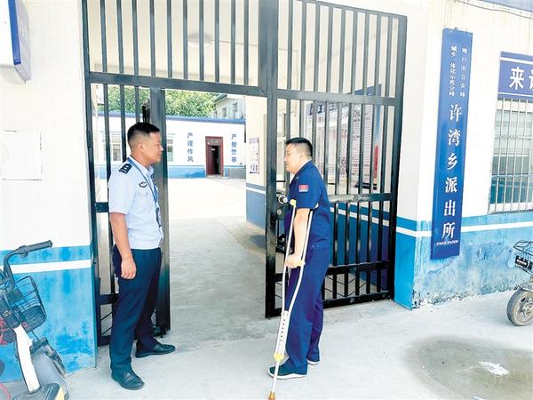 周口市城乡一体化示范区消防救援大队大队长杨振凯7月份遭遇一场交通意外事故,造成小腿关节处骨折,手术之后,很快就回到了工作岗位。这是近日杨振凯拄着双拐到许湾乡派出所为最新录用的消防员办理政审手续。 记者 朱东一 摄