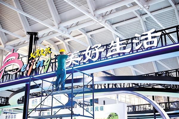 8月31日,在国家会展中心(天津),工作人员对展厅设施进行布置。