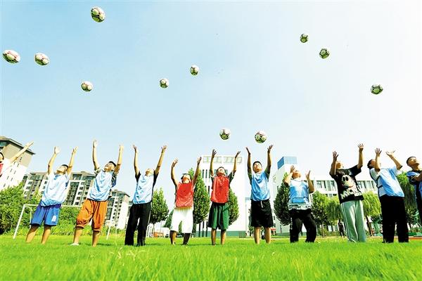 大图为8月31日,河南省焦作市温县第四实验小学学生在体育课上学习足球技能。