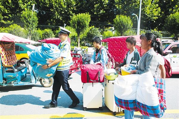 近日,太康公安开启“护学模式”,增派警力在学校门口及周边道路指挥过往车辆有序通行,帮助学生抱被拿物,让家长放心、学校安心、学生开心。图为民警护送学生入校。记者 张洪涛 通讯员 张磊落 摄