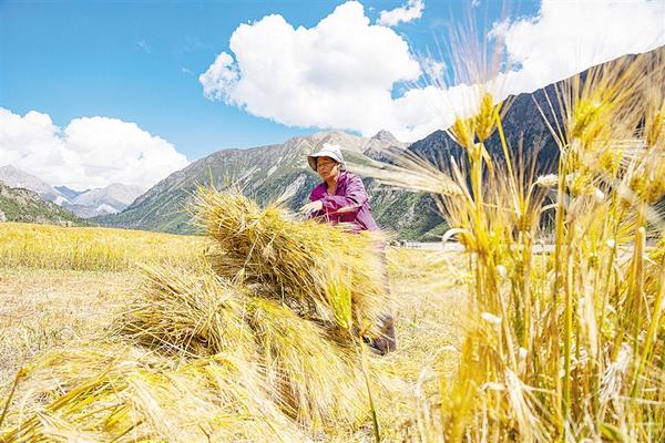 图①为然乌湖畔的农田(9月4日摄)。图②为 西藏昌都市八宿县然乌镇瓦巴村村民在捆绑刚割下来的青稞(9月4日摄)。