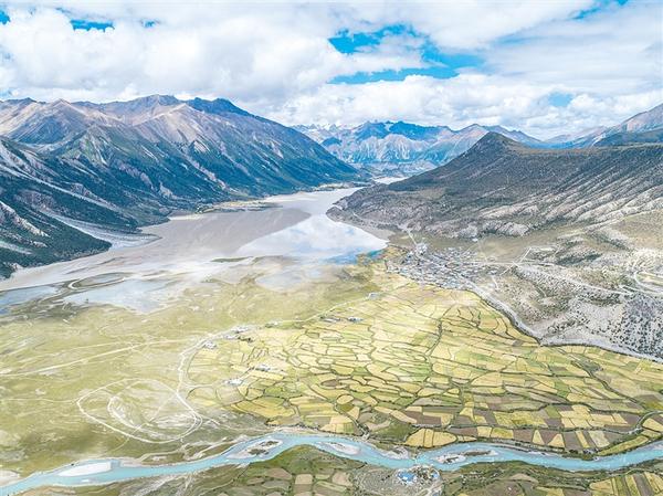 位于西藏昌都市八宿县境内的然乌湖是西藏东部最大的湖泊,八宿县然乌镇瓦巴村坐落在然乌湖畔。正值秋收农忙时节,大片金黄的青稞在风中摇曳,然乌湖景与秋收盛况交相辉映,勾勒出一幅优美的田园画卷。