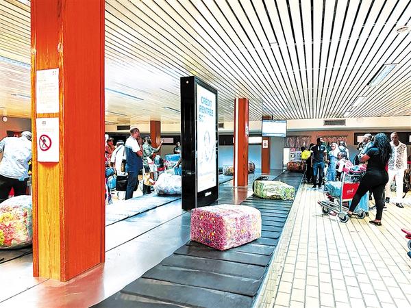 9月6日,在加蓬首都利伯维尔,乘国际航班抵达的旅客在利伯维尔国际机场内取托运行李(手机照片)。