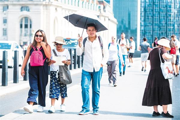 9月6日,人们行走在英国伦敦威斯敏斯特桥上。 本周,英国多地气温超过30摄氏度。史蒂芬·程 摄(新华社发)