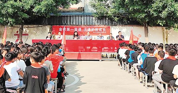 为深入推进学校法治宣传教育活动,切实增强青少年法治意识,9月8日上午,商水县白寺镇司法所联合派出所、应急办等部门到白寺学校开展普法宣传活动。图为活动现场。记者 马治卫 通讯员 周明 王鹏 摄