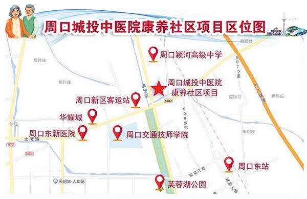 “康养社区位于示范区高铁片区内,规划建设有康养社区、周口市中医院老年病医院、周口市中医院分院等项目,医疗资源丰富,建成后将为周边群众就医提供便利条件。”示范区高铁片区专班负责人说,该片区位于城市东西发展主轴,地理位置优越,与“一中心两组团”各中心紧密联系,是城市功能和产业拓展的重要承载区以及城市中心发展的重要支撑。片区周边有周口新区客运站、华耀城客运站、周口东站等公路高铁站点,有文昌商务中心、华耀城、新荷花市场等商贸综合体,有盛和小学、文昌中学、北师大附中、河南科技职业大学等院校,有周口市中心医院文昌院区、周口东新医院等医疗机构,还有芙蓉湖公园、引黄调蓄水域等公园绿地,可以满足全龄化人群对出行、购物、医疗、休闲娱乐、子女教育等多方面的需求。