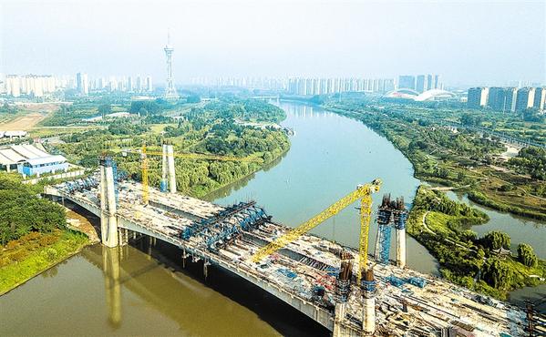 9月13日,空中俯瞰合龙后的七一路跨沙颍河桥,蔚为壮观。 该桥投入使用后,市民出行又增添一条新的便捷通道,将对提升城市品位品质、优化路网互联互通、带动促进区域合作、加快地块开发利用等产生积极作用,为我市经济社会更好更快发展提供坚实保障。记者 沈湛 摄