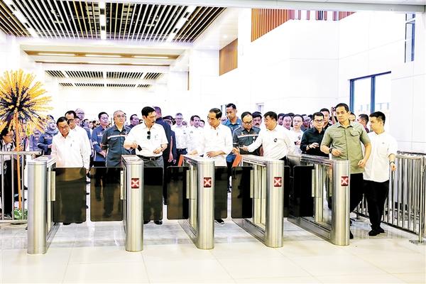 9月13日,在印度尼西亚雅加达,印度尼西亚总统佐科(中)在雅万高铁哈利姆站刷票进站。