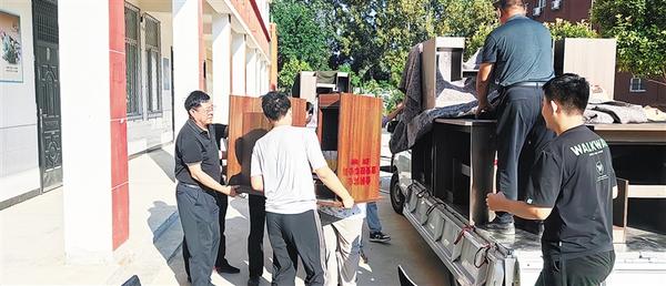 近日,中国好人、太康县童安校车有限公司董事长赵金豹向高朗二中捐赠20套桌椅,用于改善该校教学条件。图为赵金豹(左一)和员工一起搬运桌椅。