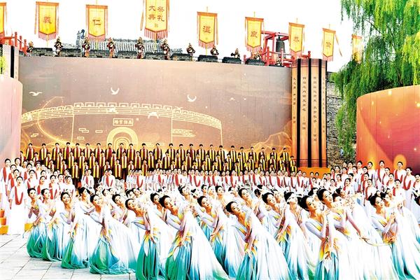 9月28日,在中国(曲阜)国际孔子文化节·癸卯年祭孔大典上,参加开城仪式的演员在表演乐舞《盛世华章 和合大同》。