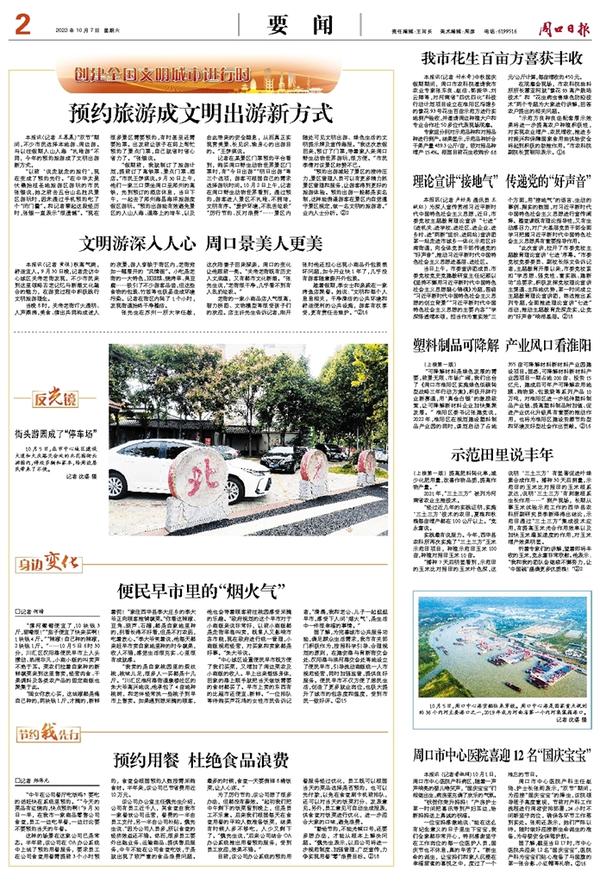 记者在某景区门票预约平台看到,购买周口野生动物世界景区门票时,有“今日出游”“明日出游”等三个选项,游客可根据自己的需求选择游玩时间。10月2日上午,记者在周口野生动物世界看到,通过预约,游客进入景区不扎堆、不拥堵,文明有序。“爱护环境,不乱丢垃圾”“厉行节约、反对浪费”……景区内随处可见文明出游、绿色生活的文明提示牌及宣传海报。“我这次放假回来,预订了门票,带着家人来周口野生动物世界游玩,很方便。”市民李倩对该景区称赞不已。