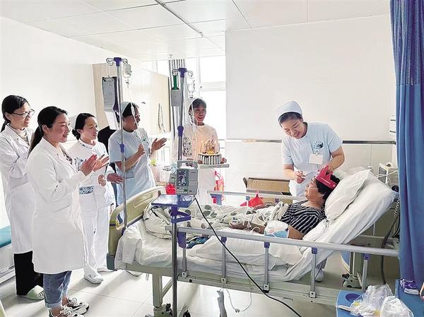 在深情的祝福歌声中,护士为于女士戴上寿星帽,点燃蜡烛。于女士脸上洋溢着幸福的笑容,动情地望着医护人员连声致谢:“谢谢你们想得这么周到!”