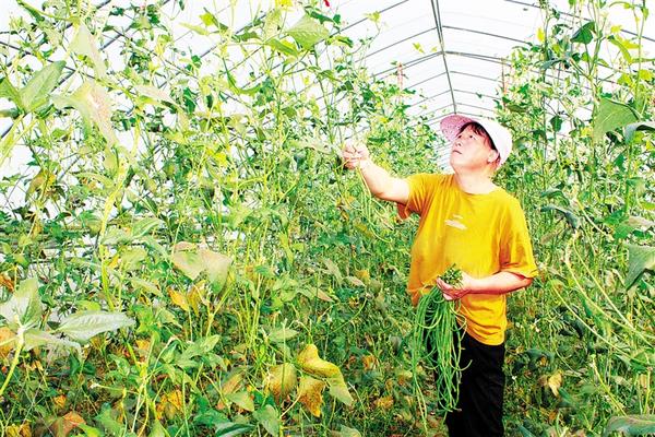 近年来,太康县各乡镇因地制宜,积极调整农业产业结构,大力发展特色产业,助力乡村振兴,群众幸福感不断增强、满意度日益提升。图为太康县逊母口镇刘桥行政村一名村民日前在蔬菜种植大棚里采摘成熟的豆角。