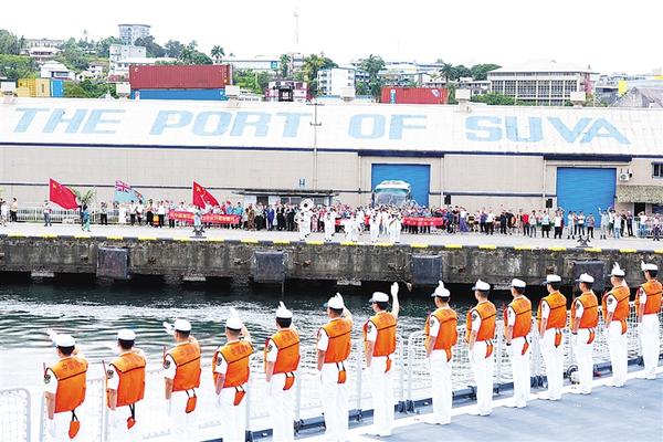 10月8日,人们在斐济苏瓦港国王码头为中国人民解放军海军戚继光舰官兵送行。 搭载300余名海军院校学员的中国人民解放军海军戚继光舰10月8日结束对斐济友好访问,离开斐济首都苏瓦,继续开展远海实习。 高密 摄(新华社发)