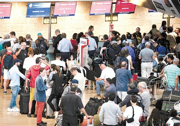 10月8日,旅客在以色列特拉维夫附近的本-古里安国际机场排队值机。 巴勒斯坦和以色列新一轮武装冲突爆发后,各航空运营商10月7日起纷纷取消飞往以色列的航班。记者在现场看到,目前该机场运行正常,进出港旅客秩序井然。 新华社记者 陈君清 摄
