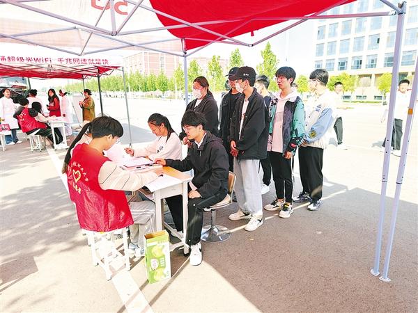 近日,市中心血站联合河南科技职业大学开展无偿献血活动。图为活动现场,河南科技职业大学学生有序排队登记,等待参加无偿献血。