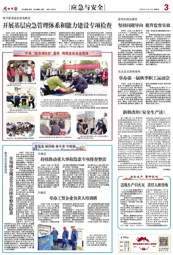 截至目前,鹿邑县26个乡镇(办事处)均建立了应急管理委员会和“一办、一队、一库、一平台”的“1+4”应急体系;561个村(社区)均建立安全劝导站和安全劝导员、灾害信息员、民兵应急救援队伍的“1+3”应急体系;建设了30个应急小站,充实村级应急物资储备,全面提升了基层应急能力;通过群众喜闻乐见的形式,开展安全宣传工作,为安全宣传进社区、进企业、进学校、进农村、进家庭营造了浓厚氛围。