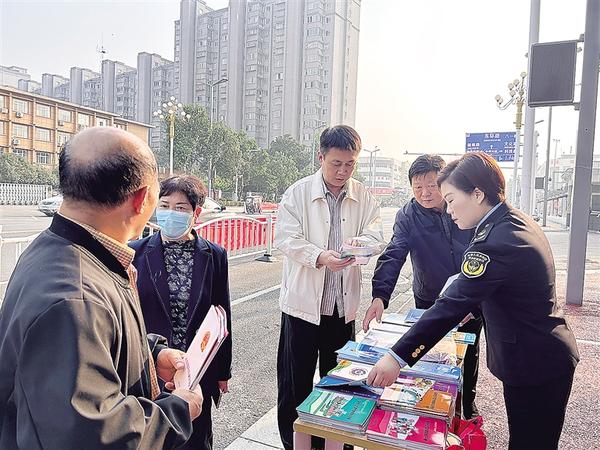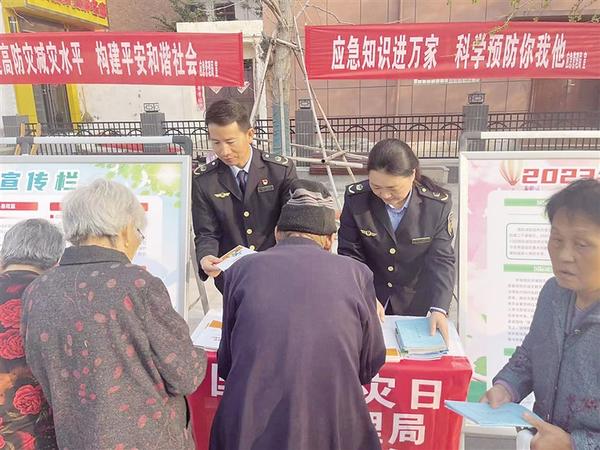 淮阳区应急管理局工作人员向过往群众宣传防灾减灾知识。