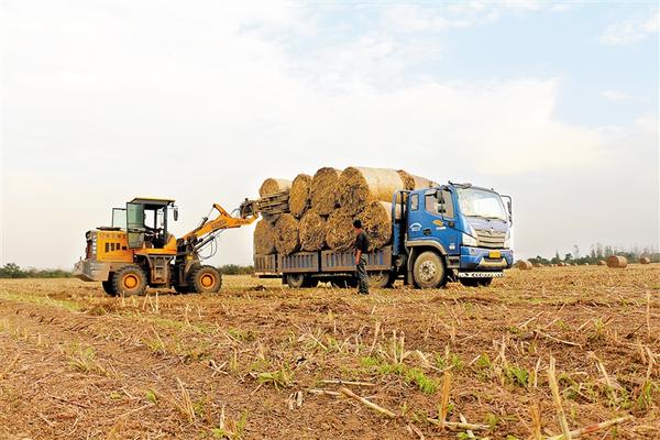 10月18日,在扶沟县韭园镇李集村田间,一家生物发电公司的工作人员正在装运打好捆的玉米秸秆。 秸秆是一种资源,废弃是害,利用为宝。今年以来,该县农业农村局积极引导群众对农作物秸秆打捆离田,不仅有效保护了环境,还开辟了增收致富新途径。卢付昌 摄