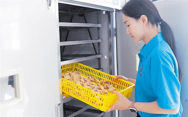 10月19日,商水县天成鸽业肉鸽良种繁育基地工作人员在查看乳鸽孵化情况。该基地以“市场为导向、资源为基础、政策为依托”,建设集科研育种、繁育推广、品牌营销为一体的“天成王鸽”祖代场,可提供200多个就业岗位,带动500户群众养鸽致富,解决周边5万亩粮食就地转化增值。记者 王映 摄