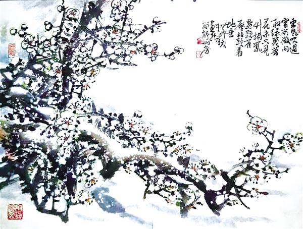 看,画者挥笔绘凌寒,总也是梅花,总也是清琼,凌空舞俏拔,雪拥雕栏,只有梅花是知己,横斜琼枝倚冰凌!