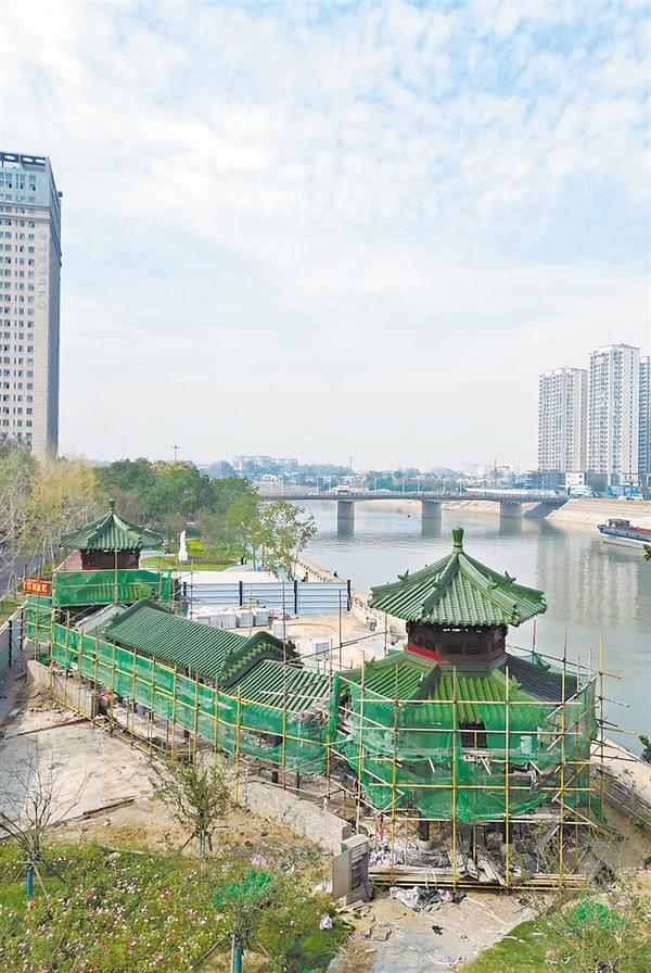 10月25日上午,记者在中心城区滨河公园看到,一座仿古双亭连廊建筑即将完工。