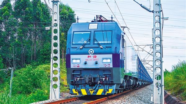 右图为一列满载集装箱的火车驶离钦州港东站(10月9日摄)。