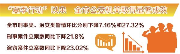 全市公安机关“夏季行动”取得显著成效:全市刑事类、治安类警情环比分别下降7.16%和27.32%。刑事案件立案数同比下降21.8%,盗窃案件立案数同比下降23.02%。侦破刑事案件2236起,侦办行政案件6469起,行政处罚3905人。侦破命案积案13起,破获公安部督办案件9起、省公安厅督办案件21起。抓获违法犯罪嫌疑人6138人,移送起诉犯罪嫌疑人4434人,抓获上网逃犯751名。受到公安部、省公安厅和市领导批示肯定7次,公安部、省公安厅贺电表彰25次。1起案例被国家移民管理局评为全国移民管理系统“夏季行动”十起典型案例之一;1起案例被公安部评为全国打击整治“飙车炸街”违法犯罪专项行动十起典型案例之一。
