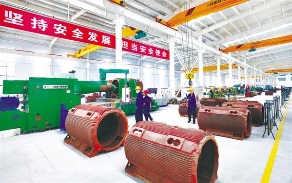 11月3日,河南省承业电气股份有限公司内,工人在年产80万千瓦防爆电机生产线上紧张忙碌着。
