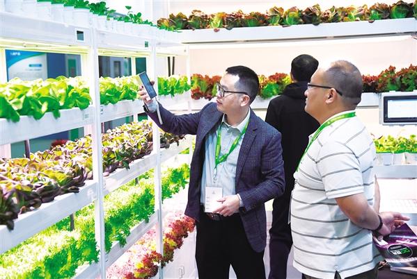 11月2日,工作人员(左)在世界农业科技博览会现场介绍智慧植物工厂。