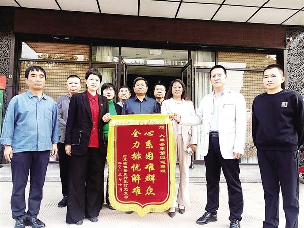 近日,符草楼镇岳庄行政村干部和村民代表自发为县委第四巡察组送去锦旗,以感谢县委第四巡察组组长周士巍等人对岳庄行政村困难群众的帮助。记者 张洪涛 通讯员 刘楷先 摄