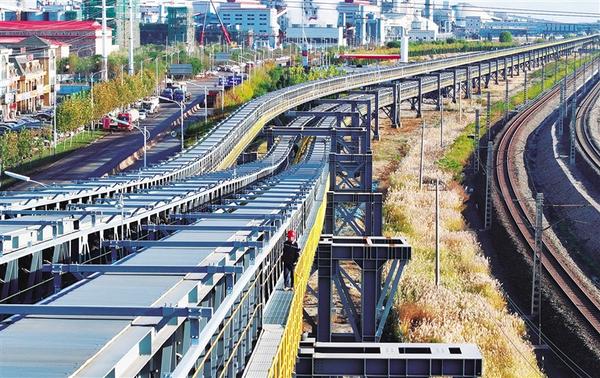 11月12日,工人在唐山海港经济开发区管带机廊道桥架上巡检(无人机照片)。近日,河北省唐山市海港经济开发区管带机廊道项目竣工,投入试运行。据介绍,该项目总投资10.96亿元,廊道长8公里,通过三条管状带式输送机为临港企业从码头堆场运输矿石、煤炭等大宗物料,年输送能力达3900万吨,将有效缓解汽车运输造成的交通阻塞,减轻空气污染,促进区域经济绿色发展。 新华社记者 杨世尧 摄