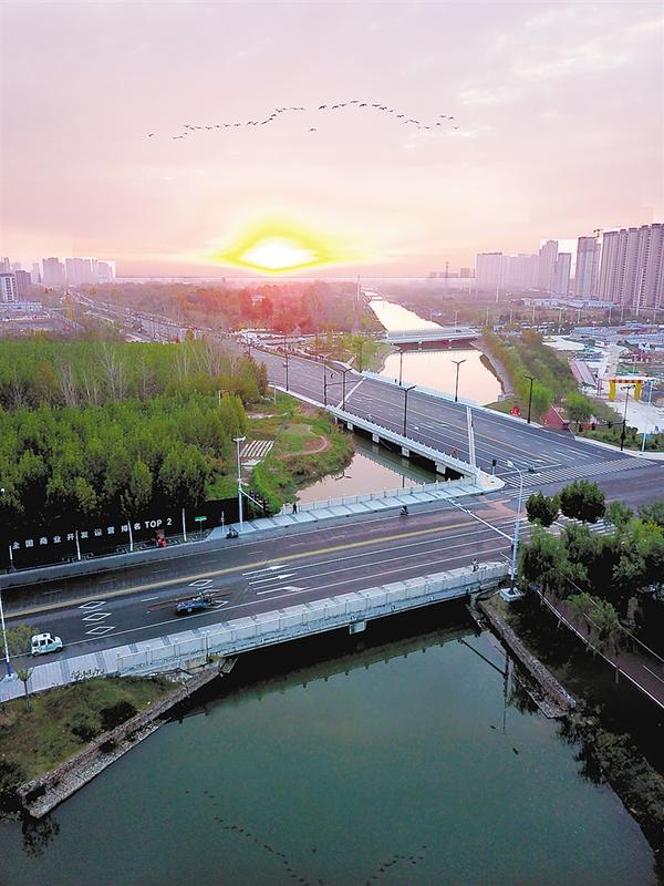 11月13日清晨,车辆在中心城区人和路、腾飞路、庆丰东路跨洼冲沟桥上行驶。一水三桥,路畅景美。记者 沈湛 摄