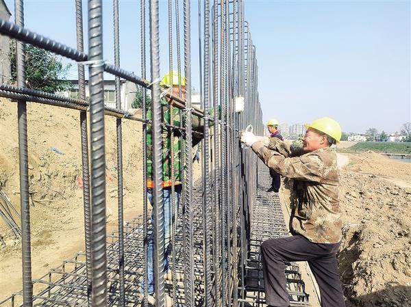 11月14日,几名工人正在贾鲁河河堤治理项目工地忙碌。该项目完工后,将有效保障沿河居民人身和财产安全。记者 沈湛 摄