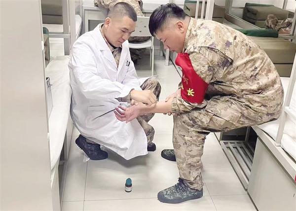 在完成日常集训任务的同时,于阳阳主动承担医疗救护员的职责。每次在完成高强度的训练之后,他顾不上休息,为战友监测血压、心率;战友训练中受伤了,他马上跑来消毒包扎;战友身体劳累了,他过来按摩放松。他不知疲倦地跑前跑后,凭一腔热忱和娴熟的技能,赢得了领导和战友的交口称赞。