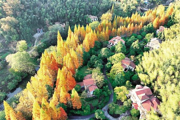 初冬时节,在位于江西省南昌市的梅岭国家森林公园,红色的水杉、黄色的银杏、绿色的松柏等相互交错,构成一幅美丽的冬日画卷,吸引不少游客前来观赏。