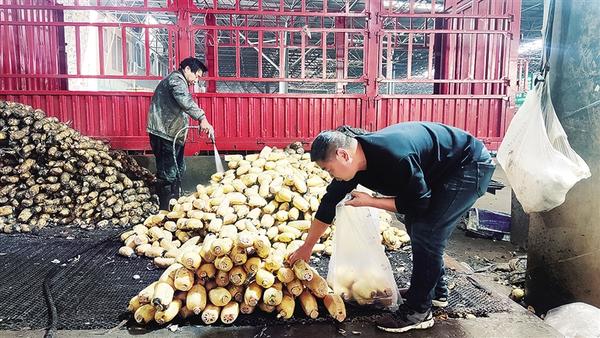 时下,本地莲藕大量上市。图为黄淮大市场一商户刚从商水县购进的一车莲藕,工人们忙着分拣、清洗、打包,及时供应市场。据了解,10月份以来,该商户每天购进本地莲藕2万斤左右,当天即能售完。