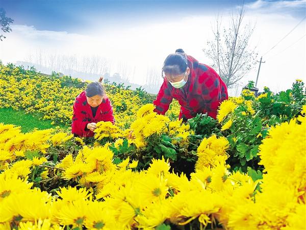 近日,叶埠口乡英沃村的百亩菊花竞相绽放,村民趁着晴好天气抓紧采摘,一派菊香人忙的丰收景象。图为村民采摘菊花。