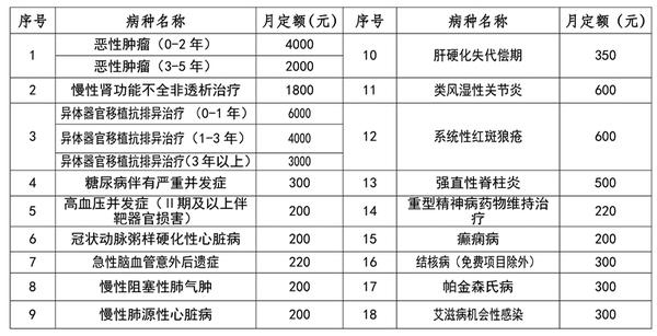 周口市城镇职工门诊重症慢性病18个病种(详见表格)。