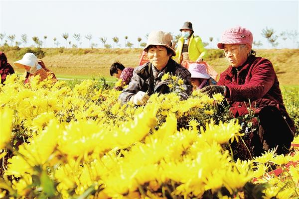近年来,郝岗镇坚持党建引领,发展特色种植产业,引导群众种植菊花等经济作物,实现农业增效、农民增收,助力乡村振兴。图为近日郝岗镇大路李村村民抓紧采收菊花。