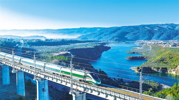 1月26日,列车行驶在丽香铁路线上(无人机照片)。当日,丽江至香格里拉铁路开通运营,两地间最快1小时18分可达,昆明经大理、丽江可直达香格里拉。新华社记者 胡超 摄