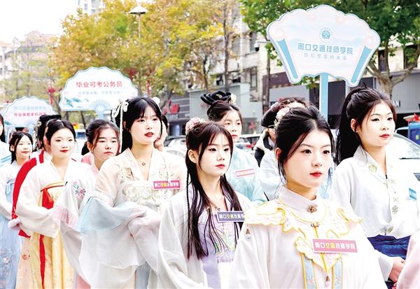 近日,周口交通技师学院汉服模特表演队200余名学生,在万顺达商场举行以“汉服归来 华夏复兴 衣冠先行”为主题的汉服模特表演研学活动。学生们的精彩表演,不仅为市民奉上一道文化盛宴,也吸引众多市民前来观看拍照留念。记者 臧秋花 摄