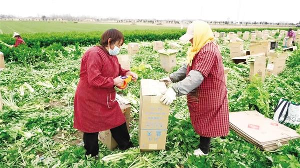 近日,辛集镇的近千亩芹菜进入收获期,菜农们忙着收割、剪根、打捆、装车,干劲儿十足。 记者 侯国防 通讯员 杨健 摄