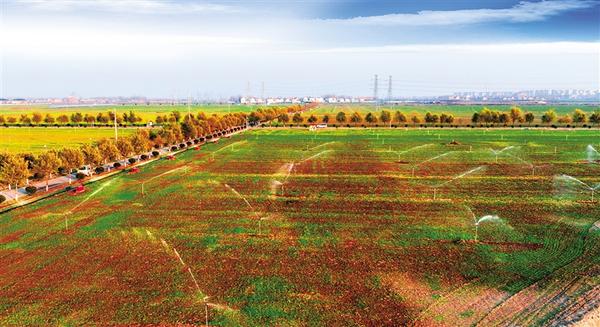 12月2日,记者在河南周口国家农高区郸城县高标准农田示范区看到,种植大户使用中心支轴式、固定式、平移式、卷盘式高科技喷灌设备为小麦灌溉越冬水。