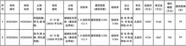 拍卖报价时间: 2023年 12月27日9时(HY2023041地块);2023年12月27日9时10分(HY2023042地块)。