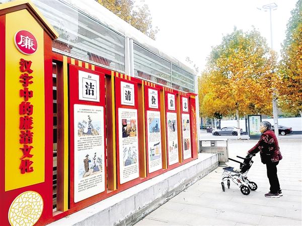 近日,市城乡一体化示范区首个廉洁文化主题广场亮相。该广场位于文昌大道和嵩山路交叉口附近,由习语倡廉长廊、汉字中的廉文化、廉洁名人栏、爱莲说、清风竹林、廉洁齐家、廉洁小故事、家风家训八大板块组成,运用户外艺术化表现方式,巧妙地将廉洁文化嵌入城市景观之中,营造了以文化人、以文润德、以文养廉的浓厚氛围。图为一名老人驻足观看汉字中的廉洁文化板块展示内容。