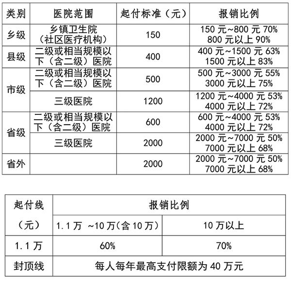 1.住院医疗待遇。参保居民在定点医疗机构发生的政策范围内住院医疗费用,起付标准以下由个人支付;起付标准以上由住院统筹基金按比例支付,额度不超过住院统筹基金年度最高支付限额。
