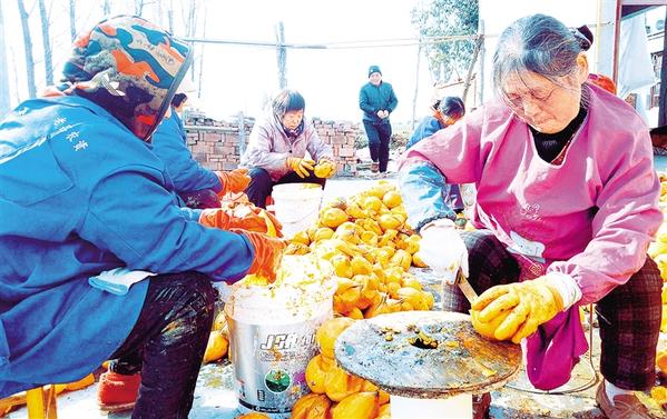 瓜蒌的皮、茎、籽具有较高的药用价值。12月20日上午,在项城市贾岭镇王竹园行政村新春种植合作社瓜蒌加工现场,刚刚采摘的瓜蒌堆成小山,村民王娥等十多名妇女围坐在一起开瓜、取瓤,个个喜笑颜开。 记者 张志新 摄