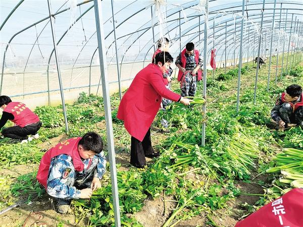 近日,在县红十字会的帮助下,菜农朱彦乐将种植的2万斤芹菜无偿捐赠给该县一些学校的食堂。图为县红十字会组织志愿者采摘芹菜。记者 张猛 孙靖 通讯员 王平 摄