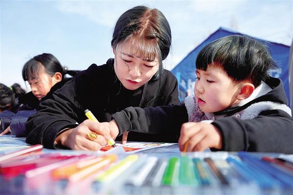 12月22日,在积石山县大河家镇大河村安置点,志愿者带着小朋友画画。